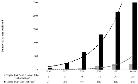The number of papers found in Google Scholar from the period of 2016—2021. The keyword used for the search is “Digital Twin” and “Robotics” for the data represented in black and the keyword used for the data in grey is “Digital Twin” and “Human Robot Collaboration.” The trend line indicates that interest in these areas has increased significantly since 2016.