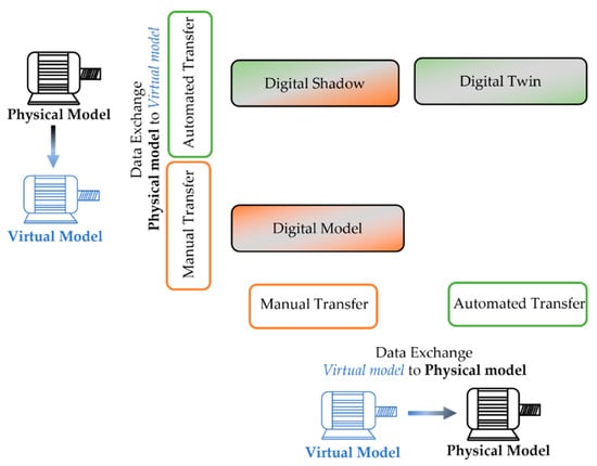 In a digital system, the type of exchange of data describes the form of the digital system. The mode of interaction and exchange of data between the physical model and the virtual model can be manual or automated. If the transfer of data between both the models is manual, it is known as a digital model. Likewise, if the exchange of data between the models is automated, it is known as a digital twin. Finally, if the data transfer from the physical model to the virtual model is automated and not vice versa, it is called a digital shadow [1].