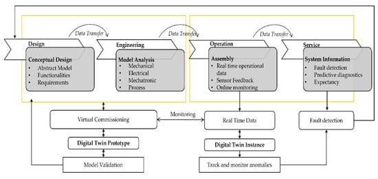 The simulation-based approach (SBA) combines the digital models and the data generated at each stage of the product development lifecycle to build the DT [23,28,49,57]. For this, the real-world object’s physical, geometrical and behavioural properties are required. Figure 5 gives an overview of the various steps in the development of DT via SBA. The SBA primarily focuses on the collection of data via multiple simulation models at various phases of the product lifecycle, such as the design, engineering, operation and service phases. SBA uses a linear approach where the information gathered at each stage is used to update the digital twin model and maintain a complete record of the product lifecycle as it evolves [58]. In SBA, the DT evolves with the real product by embedding various characteristics and properties of the product [23]. Additionally, the modules used across all four phases of the DT model in SBA need to recognise the data formats used by all other modules. Therefore, the digital thread will play a crucial role in the future of DT under SBA architecture [23,59,60]. Digital thread and data-driven communication architectures can provide seamless integration and transfer of data across the complete product lifecycle. Digital thread supports the process by having a unified data format with all the information required for the exchange of data between the physical and virtual models of the DT [60].