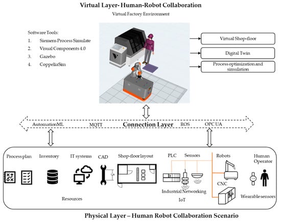 One of the main concerns with using such intelligent collaborative robots is the safety of the operator while partnering with the robot to carry out the tasks [11]. Safety is an important issue, especially for autonomous robotic tasks in a broad range of applications [12]. One approach to address this problem is to develop a simulation model to replicate and test the actual scenario before it is deployed on the shop floor. This process has been further enabled by the development of IoT and CPS systems that have resulted in high fidelity virtual simulation models capable of acquiring the properties of the physical system. Simulation models that precisely demonstrate a physical system in real-time are known as digital twin (DT) [1,13]. The DT can operate in synchronization with the physical system by utilizing the data acquired and exchanged via the IoT network [14]. DTs, which have evolved using the technological platform of Industry 4.0 [15,16], provide robust models to evaluate, in a virtual manner, the performance of the human and the robot before deploying in the real environment.
