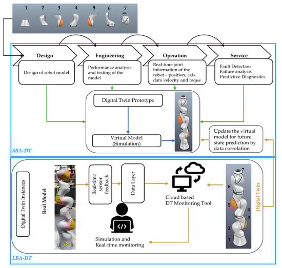 Figure 7 suggests a conceptual framework involving SBA and LBA for developing the DT of a collaborative robot.