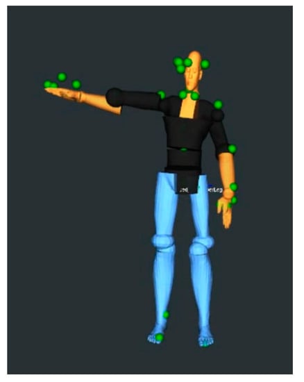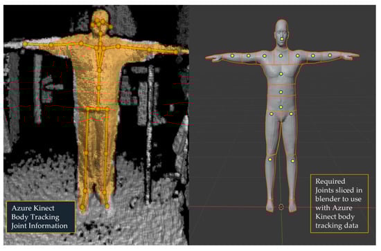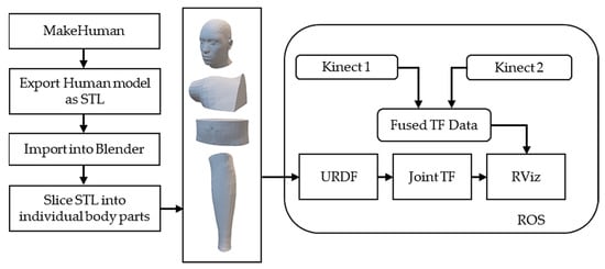 An overview of the proposed approach is shown in Figure 8. Here, a human model is created using the open-source platform MakeHuman. This model is then imported into Blender in STL CAD format. The human model is sliced into several parts, as shown in Figure 9, using Blender to create a URDF model. This model is then imported into RViz in the ROS environment for visualization. The proposed approach also involves multiple Azure Kinect sensors, which provide real-time tracking information about the operator. Sensor fusion approaches were used to combine data from these Azure Kinect sensors. The fused data are then used to control the human model in RViz, creating a digital replica of the human that responds to the real time motion of the actual human. ROS provides a package called TF frames, which is used for one-to-one mapping of human joints to the joints of the human model created in RViz. This package facilities the tracking of multiple co-ordinate frames/joints. The body tracking information from the vision system published as MarkerArray (dots shown in Figure 10) is converted and published as TF frames. The number of joints published as TF frames corresponds to the exact number of joints present in the URDF of the human model. Furthermore, the joint name published as TF from the camera should be the same as the human joint’s name in the URDF to enable the tracking. So, when the body tracking data and the URDF are launched, these are synchronized and the human motion in real-time can be used to visualize the actions of the operator in RViz, as shown in Figure 10.