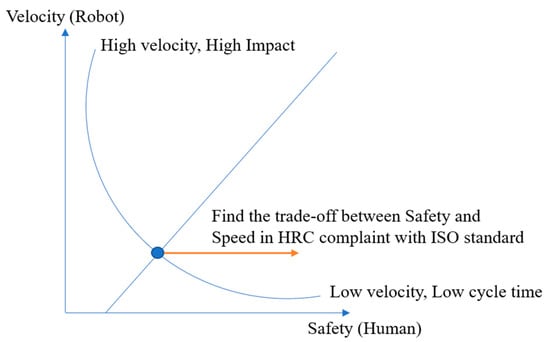 The concept of collaborative robots was introduced in the automotive industry during the late 1990’s to increase the safety, quality, and performance and improve the ergonomics of assembly processes [31]. Since then, the capabilities of collaborative robots have increased over the years, initially from using a single-arm collaborative robot to the use now of dual-arm collaborative robots to perform manufacturing tasks [32,33]. The main advantage of using collaborative robots within the manufacturing sector is their ability to work together with the operator without the necessity of being located in a secure enclosure [34,35]. The terms collaboration and cooperation represent two different aspects of HRC. Collaboration means working together to achieve a common goal, whereas cooperation means when the operator and robot work together to achieve a shared goal [36]. Furthermore, depending on the scenario, the relationship between humans and robots can be classified as coexistence, interaction, cooperation and collaboration [37].