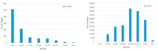 43] dataset. We used some of the CACD dataset to train our model, and the rest of them were used for evaluation. The distribution of ages in the CACD and FG-NET datasets is shown in