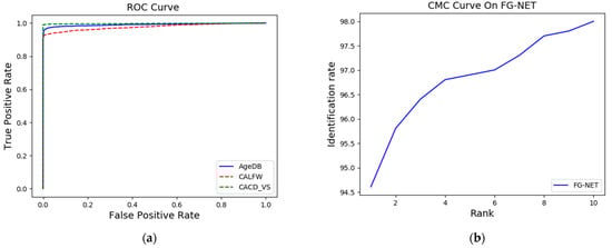 Figure 10a, we created the ROC curve on the cross-age datasets (CACD-VS, CALFW, and AgeDB) by plotting the true positive rate against the false positive rate. To evaluate the identification accuracy with the FG-NET dataset, we used the cumulative match curve (CMC) to measure the 1:k identification system performance. The evaluation schemes for the different datasets are described next.