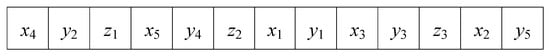 The algorithm adopts a single chromosome encoding method. Each particle includes a coding scheme. First, Z denotes a set of segmentation numbers, |Z| = l − 1, where |Z| represents the number of elements in set Z. A chromosome is denoted as S = <x1, …, xi, …, y1, …, yj, …, z1, …, zo>, where x1–xi ∈ X are the indexes of unloading task points, y1–yj ∈ Y are the indexes of loading task points, and z1–zo ∈ Z are the segmentation numbers. The segmentation numbers are used to segment the chromosome to obtain scheduling sequences of AGVs.