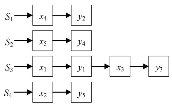 For example, we assume that an unloading task point set is {x1, x2, x3, x4, x5}, a loading task points set is {y1, y2, y3, y4, y5}, and a segmentation number set is {z1, z2, z3}. The chromosome is S = <x1, x2, x3, x4, x5, y1, y2, y3, y4, y5, z1, z2, z3>. The three segmentation numbers divide the chromosome into four parts, as shown in Figure 2. Each part represents a scheduling sequence of an AGV, denoted by S1–S4, respectively. S1’s scheduling sequence is <x4, y2>, S2’s scheduling sequence is <x5, y4>, S3’s scheduling sequence is <x1, y1, x3, y3>, and S4’s scheduling sequence is <x2, y5>. The AGVs’ scheduling sequence is shown in Figure 3.