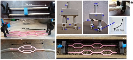 Reservoir-vascular network details: (a) pair of ceramic tubes mounted on 3D printed reservoirs; (b) 3D printed PLA tubes mounted on 3D printed reservoirs; (c) 3D printed PLA tubes mounted on flexible inlet/outlet tubes; (d) detail view of the 3D printed reservoir; (e) the networks embedded into the concrete mold during casting.
