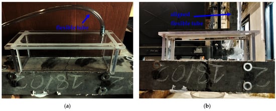 Water permeability: A water basin was developed in-house by means of poly (methyl methacrylate) (PMMA), the design was chosen according to the testing procedure and is illustrated in Figure 3. The inner dimensions of the basin were 300 × 100 × 80 mm3. Before testing, the basin was positioned at the bottom side of the beam, centered to the middle zone and sealed with silicone glue. A hole was drilled through the basin top plate, and a measuring tube with an inner diameter of 12 mm was screwed on the basin (Figure 3a). The basin was fully filled with water through the tube at the top (Figure 3a) to ensure enough water pressure was built at the crack face during testing. The tube was aligned vertically before testing (Figure 3b) and the test started when the water in the tube was up to 200 mm high. Starting from this point, the water level drop was tracked by a chronometer. The time at which the water level dropped by 100 mm was recorded and the permeability coefficient (k in m/s) was obtained accordingly [] (Equation (2)):