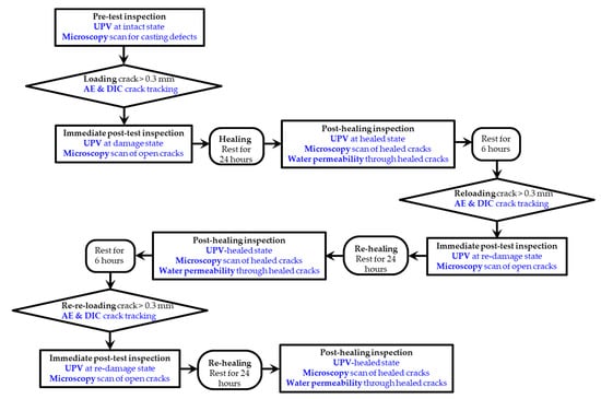 Testing procedure: The testing procedure is summarized in Figure 4. Before and after loading, inspection of the cracks was performed combining the UPV, microscopy scan and water permeability tests. It should be noted that the UPV measurements were conducted on dry concrete beams and earlier to permeability tests. After the latter, the samples were left to dry for at least 6 h prior to loading. Cyclic loading occurred as long as the cracks were healed and the healing network was clear, therefore the agent could be cleaned out after loading. Up to three loading cycles were performed at each beam.