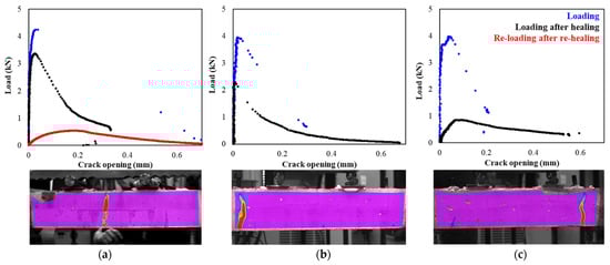 After healing, the recovery of mechanical features was the first indication of a successive intervention. The load is plotted in Figure 5 against the crack opening as measured by the DIC horizontal displacement of two points fixed at both crack faces at the bottom of the beam. In contrast to other studies that report on load-deflection curves, herein the DIC online and continuous displacement tracking permits accurate tracking of the crack onset and progress. Three cases are illustrated in Figure 5 and their mechanical results are summarized in Figure 6:
