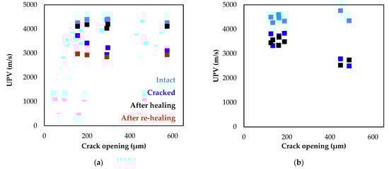 It should be noted that both Figure 7 and Figure 8 report on inspection relative to the crack size at the end of the first loading cycle as obtained by DIC. This way the authors wish to communicate the critical role of crack opening on healing feasibility. The UPV inspection accuracy was proven by the fact that the velocity remained high relative to the intact state for small-size cracks (see dark blue dots series) and significantly dropped as the cracks were open up to 550 μm. Interestingly, after healing, all cracks, regardless of their size, appeared well-sealed and recovered in Figure 7a. Thus, it is shown that the healing provided by vascular networks can be effective at any crack size.