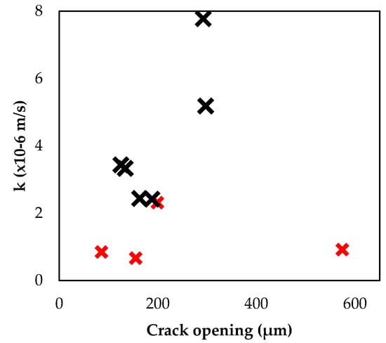 On the contrary, no link between the crack width and the water permeability could be acquired. Previous studies reported on the fact that healing can be achieved, although the crack is partially sealed []. The crack plane roughness and spatial topography appeared to control the water flow and as a result, cracks of identical size appeared to have different permeability coefficients [].