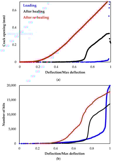 The AE and DIC results are presented standardized to maximum deflection for comparison reasons. Both methods validate that the crack initially formed in the brittle mode, almost instantly reaching the ultimate load. The crack re-opening was characterized by a limited crack opening at the ultimate load; however, extensive post-softening occurred and as a result the crack gradually widened and, due to healing, the brittle catastrophic failure was not developed. This is also reported by the progressive rise on AE hits, compared to the late and steep increase of this at the first loading cycle (Figure 9b). At the third loading cycle, the material resistance to damage was limited as depicted by the early large crack opening and the premature high population of AE hits, clear evidence of unsuccessful re-healing.