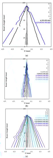Analytically, the crack profile at each loading cycle is given in Figure 10. The DIC full-field view of the crack’s morphology illustrates the damage state, respectively: