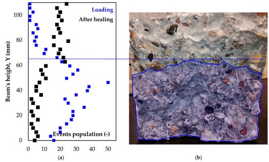 (a) AE events distribution along the beam’s height (Beam 4); (b) detail of the crack plane with the area covered by healing agent marked in blue.