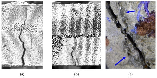 The crack shape was modified when healing agent was delivered, filling the crack void. As shown in Figure 12a, a discrete unique crack formed and re-opened in the case of an unhealed beam. On the contrary, a second branch of the initial crack was formed in the case of a healed crack depicted in Figure 12b. The right branch of this crack formed at initial loading, whereas the left formed in the following test cycles after healing. Additionally, another branch of this crack initiated at the bottom of the beam at the end of the reloading cycle (detail view—Figure 12c).