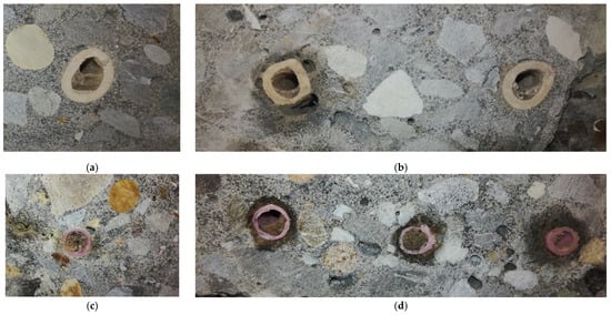 The unsuccessful repeatable healing can be attributed to extensive clogging of the vascular network tubes as illustrated in Figure 15. Post-testing visual inspection proved that up to 50% of the cross-section of the ceramic tubes was filled up with healing agent that polymerized into the vascular network (Figure 15a,b). Although a high pressure (up to 6 bar) was applied during the tubes’ cleansing to omit this phenomenon, the agent’s viscosity was too high for the experimental needs and the agent was entrapped into the printing folds. The phenomenon was severe for the 3D printed tubes, where some sections were 100% clogged. Based on Figure 15c,d, it is hypothesized that the 3D printed vascular networks were either too thin, and therefore permeable, or otherwise and due to a thin section, the tubes were suspected to have easily broken during the concrete casting since the tubes appeared filled with cement paste as well. These remarks should be taken into account in the future design modifications and while the tubes should be sufficiently brittle to fracture along with the concrete during a damage event, they must also have a high enough strength to survive the casting process.