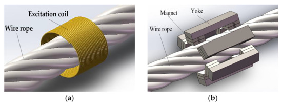 The principle of MFL detection consists of exposing the wire rope to a strong magnetic field in the axial direction. The wire rope has a higher magnetic permeability than the surrounding air, which increases the density of magnetic lines of flux flowing through the wire rope to those flowing outside. Hence, a surface-breaking defect presents high reluctance to the flow of magnetic lines of flux, thereby causing the flux lines to leak out from the wire rope around the defect. This magnetic flux leakage field is postulated to contain information about the shape and size of the defect, as well as the permeability of the wire rope and the strength of the applied axial field. MFL signals are the MFL field values measured by magnetic sensors placed over the wire rope close to the defect. In practice, the MFL technique is more effective if the applied magnetic field is strong enough to saturate the wire rope [18]. In the MFL method, magnetic sensors such as Hall effect sensors, giant magneto resistances, and induction coils are used to collect MFL distribution from the wire rope’s defect. The MFL signal is converted into the electric signal by magnetic sensors and it is convenient to process in the corresponding computer software. Induction coils used Faraday law, and it consists of copper. The Hall sensor is based on the hall effect. As the magnetoresistive (MR) effect appears, various MR sensors have been proposed, such as the giant magnetoresistance sensor, tunneling magnetoresistance, and anisotropic magnetoresistance sensor. A MR sensor is composed of a first and a second thin film layer of magnetic material separated by a layer of non-magnetic metallic material. Magnetizing is the primary step in the magnetic flux leakage testing method. The existing ways of magnetizing wire rope are divided into two types: one is based on the principle of electromagnets to magnetize the wire rope with an energized excitation coil, and the other uses a permanent magnet magnetizing steel wire rope connected by the yoke with high permeability. As shown in Figure 1a, to generalize a stable straight-line magnetic field, the exciting coil should be supplied with strong power and high stability. In this way, exciting coils with a large number of turns and big volumes are required to increase the magnetic field. For this reason, it will take too much time and manpower to wind the exciting coil to encircle a new wire rope [24]. It is also extremely inconvenient when applied in practical working sites. According to the second method, yoke type magnetizer containing two permanent magnets and a high permeability yoke with the detected wire rope compose a magnetic bridge circuit, as shown in Figure 1b. Six sets of the yoke type magnetizer arranged in the circumference direction of the wire rope compose an integral magnetizer. However, for the effect of magnetizing, a small lift-off distance has to consider as an important factor that could rub magnetic sensors which are placed between the wire rope and the yoke, inside the integral magnetizer, resulting in an abnormal signal with anomaly noise.