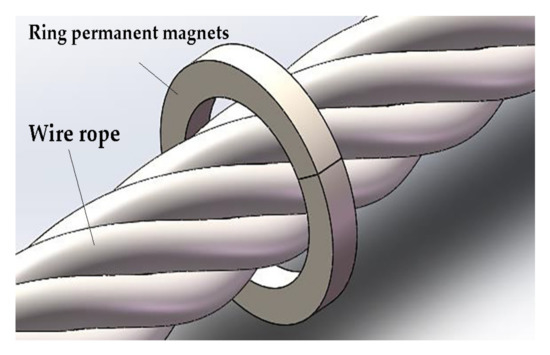 Considering the above two methods, an open permanent magnetizer is proposed, shown in Figure 2. The ring permanent magnets are magnetized along the wire rope axial direction; by using the ring permanent magnets, induction lines can enter into the detected wire rope evenly. Meanwhile, an open structure consisting of 2 semicircular magnets has been designed to encircle the detected wire rope from the middle position by opening the 2 semicircular magnets. Therefore, the symmetric ring structure magnetizer magnetizes the detected wire rope evenly and makes a large lift-off distance detection possible. Once a large lift-off distance is applied in the detecting procedure, the eccentric problem of the wire rope caused by magnets’ attraction can be eliminated [25]. The magnetic flux lines distribute more evenly under open magnetizer conditions than under yoke type magnetizer [6].