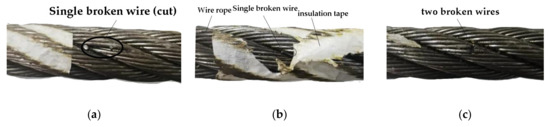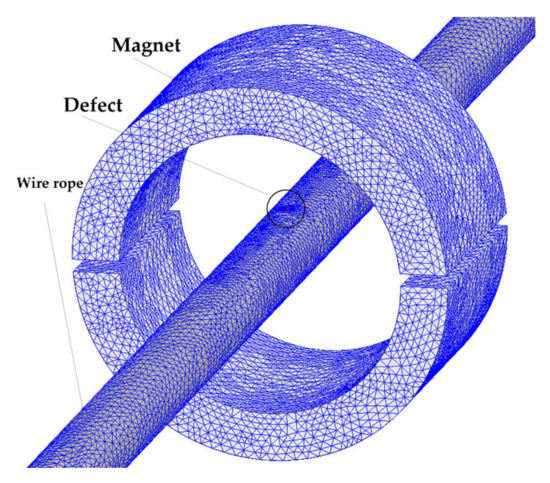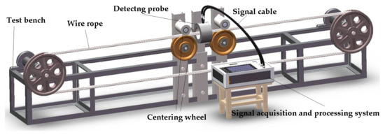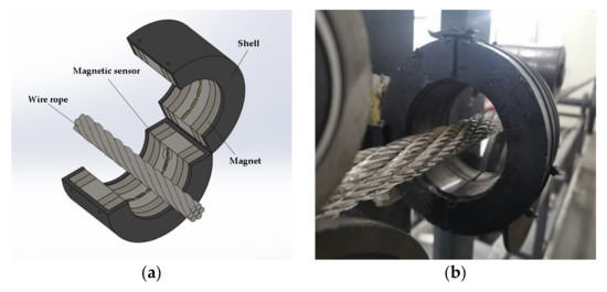 Wire rope is a slender and vulnerable ferromagnetic component that bears the most load and is related to the safety of life and property. It is widely used in mining, oil, elevators, cableway, transportation, ports, and several other vital fields due to its fatigue resistance and high tensile strength [1]. However, wire rope is susceptible to defects such as broken wire, corrosion, wear, and fatigue during the long-term use process. What is worse, these defects could occur in the internal of the wire rope, which cannot be found using the visual inspection of traditional methods [2,3]. There are growing appeals for effective wire rope detection.