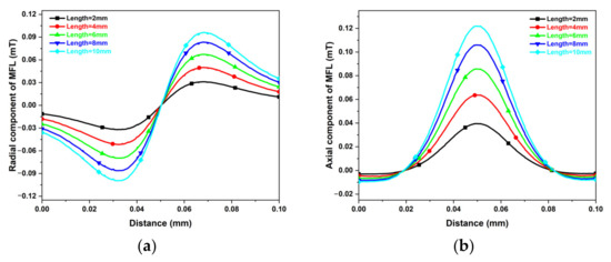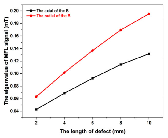 The peak-peak value of the radial component and the peak-zero value of the axial component are, respectively, measured from the two curves above. To intuitively observe the relationship between the MFL signal and the length of the broken wire, Figure 5 is drawn below. In Figure 5, the B denotes the magnetic flux density of the leakage magnetic field, and the eigenvalue of the MFL signal is calculated from the peak-peak value of the radial component illustrated in Figure 4a.