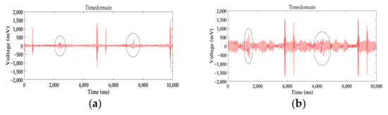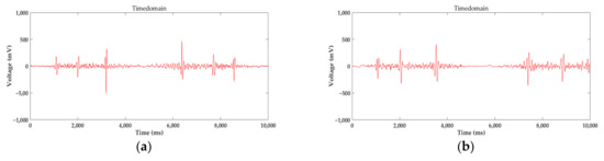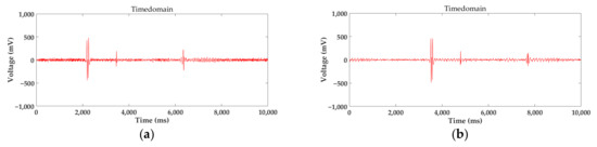 (a) 20 mm lift-off distance signal with the 24 mm diameter wire rope; (b) 25 mm lift-off distance signal with the 24 mm diameter wire rope.