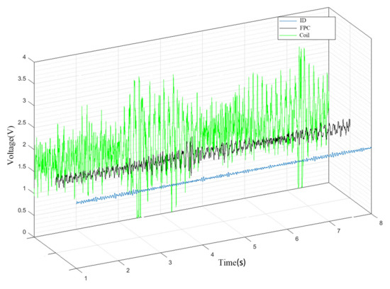 At last, the coils made of enameled wire have a high sensitivity leading to overwhelmed noise in the useful signal. Three different kinds of signals showed in Figure 12, where ID denotes induction, FPC denotes flexible printed coils, and Coil means coil made of enameled wire
