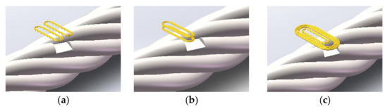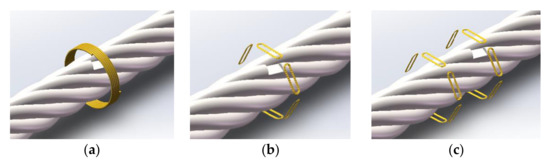 Traditional main magnetic sensors array has three types. The first one is the entangled shown in Figure 13a. It’s complicated and time-consuming to install or wind the coil at different working sites. The second one is the split with a one-row array shown in Figure 13b. At the state of small lift-off, the MFL signal can be detected with a good SNR. However, as the distance becomes larger, the energy excited by the wire rope defect’s leakage magnetic flux declines exponentially. Hence the signal collected has low SNR under no sensors or signal processing conditions. The third one is to differential signal by laying on two rows of magnetic sensors shown in Figure 13c. The spacing between the rows is equal to an integral multiple of spinning distance to match the theory of having the same strand MFL signal. After differential circuit processing, high SNR signal can be gotten. But unless the accuracy of the distance could be guaranteed, low SNR signal would occur. The signal is mixed with noise which is collected by two different arrays of the sensors. Especially, if the diameter of the wire rope is larger, the spinning distance will be farther. As a result, the axial length of the sensor head will be long and heavy, which has disadvantages in practical applications.