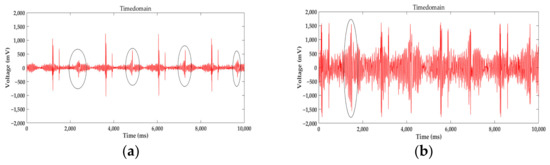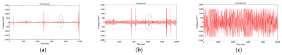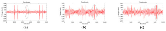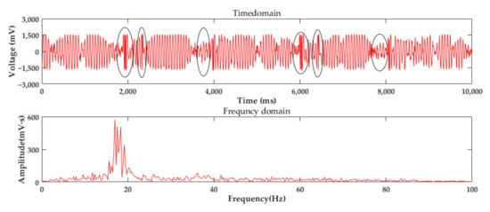 Using the traditional wire rope detecting methods, mainly hardware and software, to process the signal, the hardware circuit can filter the signal from its frequency. As shown in Figure 14, the sampling time is 10 s, and after processing the signal with noise at high speed by Fast Fourier Transform, the frequency range of the signal is almost limited to 10–30 Hz. Further, in the frequency domain analysis, different types of defects lead to different frequencies of defects. The noise could be removed through a filter and the defect signal would be received. However, only a frequency range can be gotten. The defect signal frequency and the noise frequency are so close, even mixed with each other, that we cannot distinguish the defect and noise correctly. Thus, the circuit filter cannot move the noise among the range. The defects were marked by a circle illustrated in Figure 14, and they are the same as experiments in Section 5.