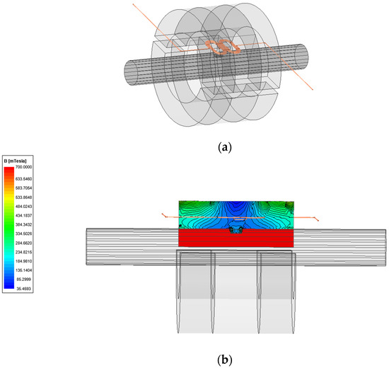 (a) 3D simulation model; (b) Cloud map of magnetic flux density.