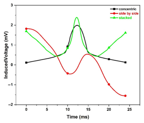 Theoretical simulations were performed for the side-by-side arrangements of two induction coils shown in Figure 16a. Figure 16b schematically demonstrated a cloud map of magnetic flux density, and it is obvious that there is a leakage of magnetic flux around the defect leading to coil induced voltage. Finally, the output voltage attained is shown in Figure 17, and according to the analysis, it is preliminarily proved that the output electromotive force of different coupled arrays of coils is different. Furthermore, the concentric coil array can get the most significant output voltage amplitude, due to its low noise and wide signal band The stacked could easily lead to noise, and the stacked could be easily vulnerable to wire rope strands.