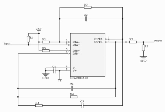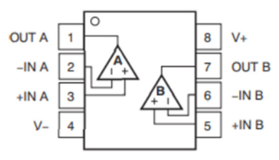 According to the targets above, the circuit structure is divided into three functional modules. The first one is weak signal amplification. The second one is a low pass filter. The third one is the high pass filter. The operational amplifier circuit is composed of OPA2188, shown in Figure 19. OPA2188 was chosen from National Instrument as an operational amplifier, and its main features include low drift voltage, low noise, zero drift, and high CMRR. Its pin diagram is shown in Figure 20 In means input and out means output. It is a dual operational amplifier. V means DC voltage.