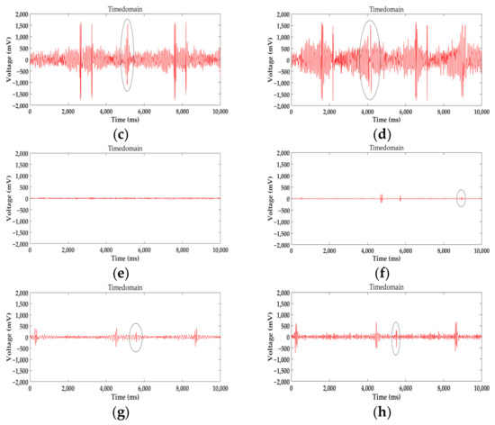 To determine the best parameters of coil sensors mentioned in Section 3, a series of experiments were carried out to preliminary study the SNR of the signal collected by coil sensors. This proceeds in two stages: the first was to focus on the best coil array, and the second was to acquire the best structure parameters of coils. Based on the experiment results, different influences of parameters were investigated and discussed in detail. All of the signals collected are shown below, including the three types of defects; a circle marks the single broken wire signal among the defects.