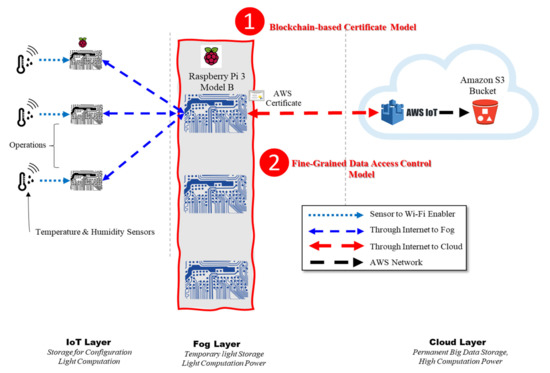 We conducted several experiments based on the three analysis methods in our previous work [6], and we found that the performance of the IoT–Fog–Cloud architecture outperforms the performance of the IoT–Cloud architecture. However, we found that the IoT–Fog–Cloud architecture does not meet the security requirements. Therefore, to fill the gap of security requirements between the IoT layer and fog layer and meet the authentication and authorization aims, first, we propose a blockchain-based certificate model of the IoT–Fog–Cloud architecture to fill the gap of the authentication problem. Second, we propose a fine-grained data access control model based on the ABE of the IoT–Fog–Cloud architecture to fill the gap of the authorization problem. Figure 1 shows an overview of the IoT–Fog–Cloud architecture and where the two security models are applied.