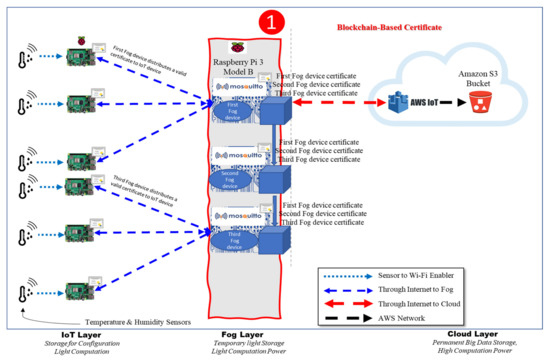 - We propose a blockchain-based certificate model of the IoT–Fog–Cloud architecture to authenticate IoT devices to fog devices to meet the authentication aim.