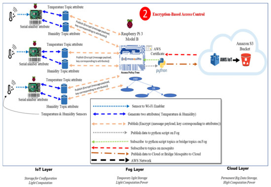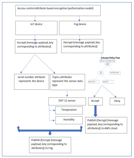 Figure 3 illustrates the several operations comprising the model, which are as follows: (1) attributes are generated for each sensor data type; (2) keys containing a set of attributes or corresponding to attributes are generated; (3) the generated sensor data type values are encrypted with the corresponding key that contains their attributes; (4) the encrypted message is published to the fog device using a secure communication channel; (5) the access tree that specifies the policy of the set of attributes is generated; (6) the ciphertext is decrypted if the key containing a set of attributes satisfies the access policy tree; and (7) the decrypted message is published to the AWS cloud. The model is designed such that each data type in an IoT device is associated with attributes, which represent the topic of each sensor data type. For example, the DHT11 sensor attached to the Raspberry Pi is considered an IoT device [6,7] and generates two types of data: (A) temperature degree and (B) humidity degree. The temperature value is encrypted according to the key that contains a set of attributes and then published to the fog device.