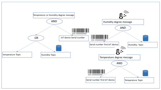 The fog device then generates an access policy tree according to the attributes of each data type in the IoT device, an example of which is presented in Figure 4. Once the fog device receives the ciphertext from the IoT device, it decrypts it if the ciphertext key that contains the attributes satisfies the access policy tree. Otherwise, it will decline the decryption request. Then, the temperature degree value will be published to the AWS cloud. Figure 5 shows how the ABE for the access control model was applied to the IoT–Fog–Cloud architecture.