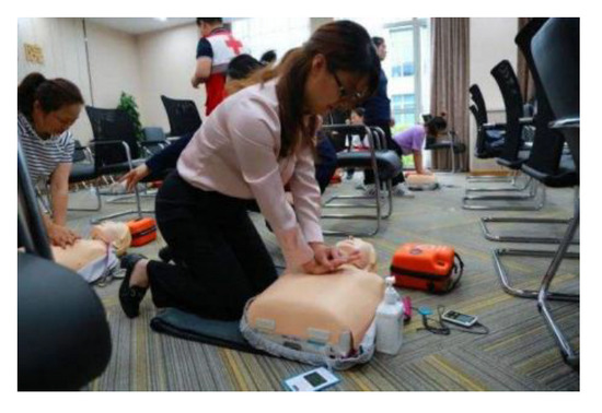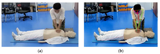 At present, the most effective method in the traditional CPR training mode is to have trainees perform CCs on CPR manikins [7], as shown in Figure 1. The manikin, which is equipped with various sensors, can provide feedback on compression depth, frequency and whether the chest fully rebounds during the operation. However, it cannot monitor the operating position and whether the elbow is straight, which is essential to ensure CC quality. Therefore, monitoring elbow straightness and operating position is generally the instructor’s work. However, one instructor can only train six people simultaneously at most, which is inefficient and unable to guarantee the quality of the supervision. Therefore, the automatic judgment of CCs is an essential step in realizing innovative CPR training and evaluation.