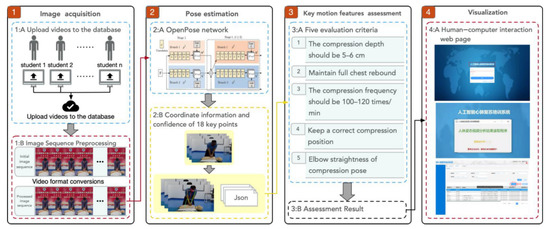 In order to evaluate the quality of CCs, this paper estimates the human pose in a two-dimensional (2D) image by applying OpenPose. By analyzing the motion features of crucial parts of the human body, this paper assesses the depth, frequency, position, chest rebound and elbow straightness of compression postures. As shown in Figure 2, the system architecture consists of four stages: image acquisition, pose estimation, essential motion feature assessment and quality evaluation. The details of each step are introduced below.