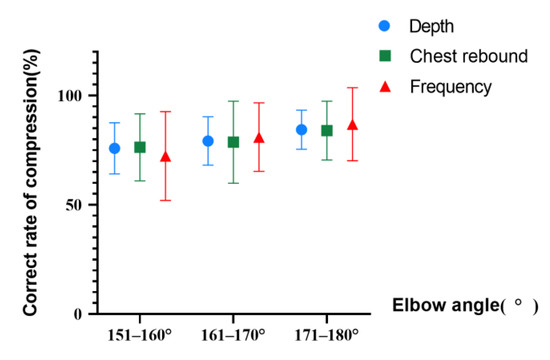 It can be seen from Figure 4 that the correct proportion of compression depth in the range of 171–180° is the highest, and the difference is statistically significant (p < 0.05) compared with the other two groups. Moreover, the trend of correct rates in the frequency group and in the chest rebound group is consistent with the depth group. Therefore, it can be concluded that, when the elbow is bent during operation, the error rates of depth, frequency, and rebounds increase, affecting CC quality.