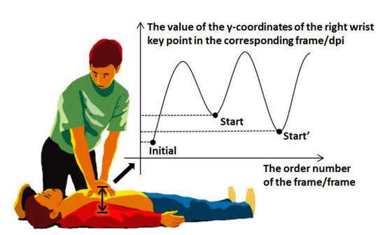 OpenPose can identify the coordinates of the key points of the human hand, so we use the max displacement of the coordinates to determine compression depth. During CCs, both hands are crossed together and pressed downwards vertically, and they have the same moving distances. Thus, we only consider the compression depth of a single hand. The initial position of the right wrist is selected as the starting position of the compression. Since the x-coordinate of the corresponding key point has no reference meaning of depth, only its y-coordinate needs to be considered when calculating.