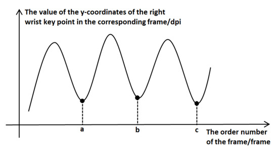 We obtained an initial video with a 30 fps frame rate and judged the compression frequency by the order numbers of frames in which the minimum point appears, i.e., the end of one single compression. For example, assuming that the abscissa is e and that there is a minimum y value, the frequency f = 1800/e. To eliminate the influence of local minimum points during the calculation, the y value is taken every two frames. Thus, in practice, the frequency f = 900/e. As shown in Figure 8, if the minimum values appear at the three horizontal axis points a, b and c from the starting position, it means that the three compressions end at the a, b and c frames. Then, we can calculate the corresponding compression frequencies f1 = 900/a, f2 = 900/(b − a) and f3 = 900/(c − b).