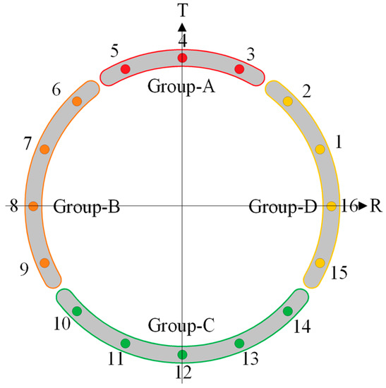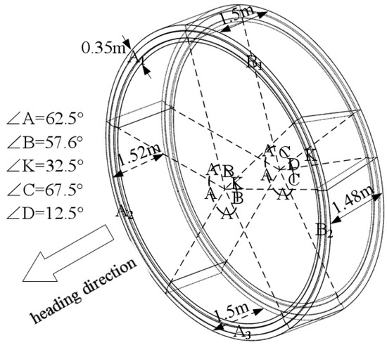 The total thrust of the jack includes six parts: Friction between shield machine periphery and soil mass, earth pressure at tunnel excavation face, friction resistance between the inner segment of shield tail and shield shell, traction resistance of rear trolley, penetration resistance generated in front of cutting ring edge during shield tunneling, and variable direction resistance of tunnel turning correction. Through the calculation of the selected typical section, the total thrust of the jack is about 14,000 kN. The jack thrust distribution is shown in Table 3, while the layout of the jack thrust is shown in Figure 10.