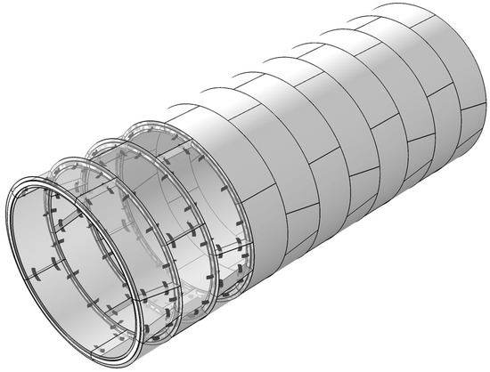 Distinct methods have been adopted in analyzing the impact of jack thrust, among which the most popular one may be the numerical approach [16,17,18,19]. Although some researchers also conducted experiments on the safety analysis of the segmental linings subjected to jack thrust [20], the numerical method shows more attraction due to its significant advantages in a parametric study [21]. It should be noted that most of the existing research applied simplified models and structures, which may cause limitations to the calculation results. In this paper, a refined three-dimensional model considering the bolts and other construction loads is proposed to study the effect of jack thrust angle change on mechanical characteristics of shield tunnel segmental linings. Discussions are carried out on the displacement, deformation, and stress of the tunnel segments and the connecting bolts. According to the obtained results, final recommendations will be provided to control the jack thrust angle.
