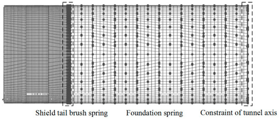 The axial direction constraint of the tunnel is set from the current position of the jack, and the ground springs are arranged outside the tunnel to simulate the soil constraint. Additionally, springs are arranged outside the third ring segment from the jack shoes to simulate the constraint effect of the shield machine tail, as shown in Figure 5.