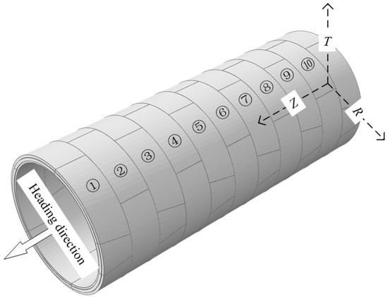 In the above formula, KR is the foundation spring stiffness, k is the foundation bed coefficient, n is the number of grids represented by the foundation spring, Si is the unit area divided by the outer segment surface, R+ denotes tunnel radius direction is positive, while R− means tunnel radius direction is reversed, and the coordinate system is shown in Figure 6. The foundation spring stiffness in the Z direction and T direction is taken as 1/3 of R positive spring stiffness in the radius direction of the tunnel.