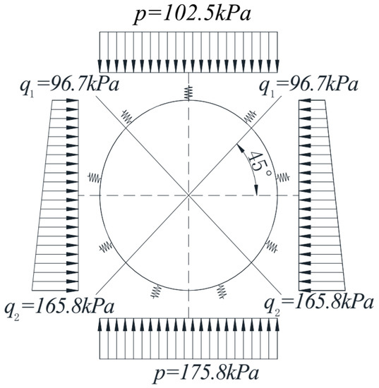 The loading state of the shield tunnel in the stratum is simulated by applying water and soil pressure and foundation spring. The foundation spring is a nonlinear spring under uniaxial compression in the radius direction of the tunnel. The calculation method of spring stiffness is as follows: