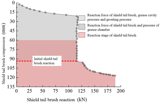 The nonlinear spring has the characteristics of automatic adjustment, distribution, and rebalancing load mode according to the deformation of the shield tunnel. The real stress state of the shield tail segment in shield tunneling is simulated by using a nonlinear shield tail spring and initial position shield tail brush reaction force. The curve of the relationship between the reaction force of the shield tail brush and the compression amount is shown in Figure 9.
