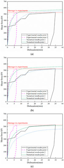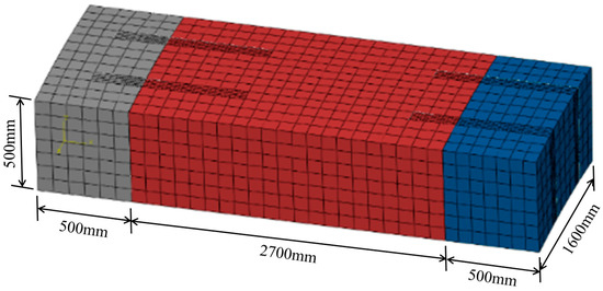 The length, width, and depth of the segments on the sides are 350, 1600, and 500 mm, while those of the middle segment are 2700, 1600, and 500 mm, respectively, as shown in Figure 11. Besides, the material properties of the segments and bolts are the same as those described in Section 3.2. The two circumferential joints are subjected to shear force during the experiments, which is simulated in the verified model. More detailed information about the verified experiments can be directly found in [22].